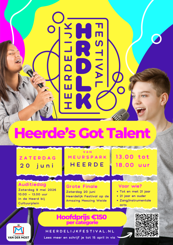 Tijdens het Heerdelijk Festival op zaterdag 20 juni 2026 is er ruimte voor lokaal talent met Heerde’s Got Talent. Dit bijzondere programmaonderdeel vindt plaats op de Amazing Meezing Weide en biedt een podium aan zangers en musici uit Heerde en omgeving. Via auditierondes op zaterdag 9 mei 2026 worden de talenten geselecteerd door een jury.